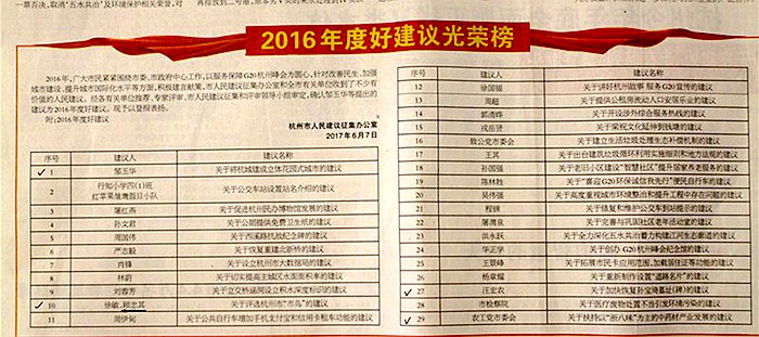 2017年6月8日,杭州市人民建议征集办公室在《杭州日报》上刊登了“2016年度好建议光荣榜”。