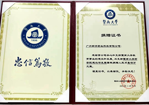 2021年11月27日,在暨南大学药学院成立20周年之际,农工党广东省医药卫生工作委员会主任、广州市食品药品工委会主任,广州新济药业科技有限公司创始人、暨南大学药学院教授吴传斌个人捐赠人民币100万元,以广州新济药业名义设立“暨南大学新济药业奖学奖教金”,用于支持暨南大学药学院研究生培养及青年骨干教师培育工作。中共暨南大学党委书记林如鹏教授、校长宋献中教授,药学院党委书记李弘剑教授、院长丁克教授出席仪式。