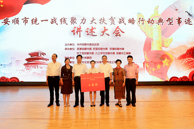 2017年8月29日,安顺市统一战线聚力大扶贫战略行动典型事迹讲述会在西秀区文化中心举行。中共贵州省委统战部秘书长邵刚,中共安顺市委常委、市委秘书长、市委统战部部长尹恒斌,农工党贵州省委副主委黄惠玲,民革省委副巡视员张大炼,安顺市人大副主任、民革市委主委梅世松,安顺市政协副主席、农工党安顺市委会主委刘飞,安顺市政协副主席、九三学社主委贺未泓,安顺市政协秘书长李宏等出席。安顺市委统战部常务副部长郭江林,民盟安顺市委主委潘祖伦,安顺市委统战部副部长袁华等领导出席,安顺市直各单位负责同志、县区统战部和统一战线代表人士约400余人观看。