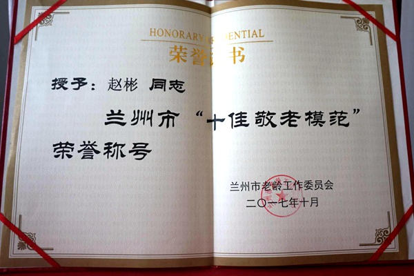 2017年10月26日,兰州市隆重举行“十大孝星”“十佳敬老模范”评选颁奖活动,20名同志分获兰州市“十大孝星”“十佳敬老模范”荣誉称号。其中,农工党兰州市城关区基层委主委、兰州市城关区康乐医院院长赵彬荣获兰州市“十佳敬老模范”殊荣。
