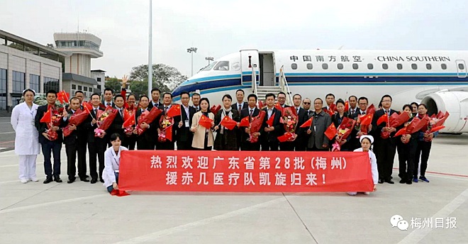 2018年1月22日上午10点19分,由梅州市组建的广东省第28批援赤道几内亚医疗队队员抵达梅县机场,圆满完成了一年半的国际医疗援助任务。农工党党员林日亮(梅州市人民医院新生儿科副主任)是这支队伍中的光荣一员。