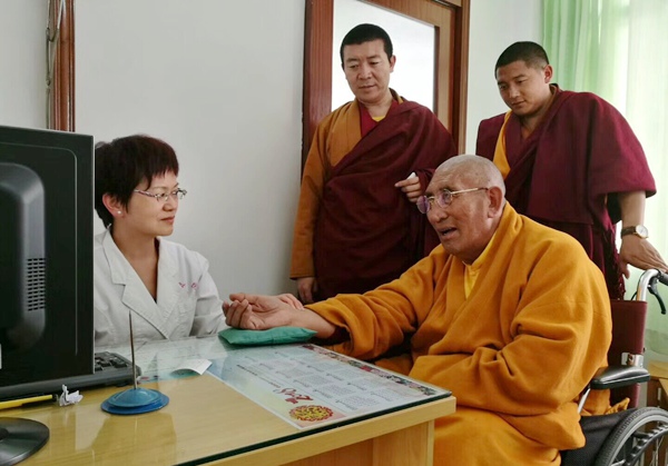 蒋丽霞主任医师热情地接待了住持一行,仔细地为扎嘎-洛绒登比尼玛仁波把脉、诊疗、开药方,慈祥的住持表示很满意。