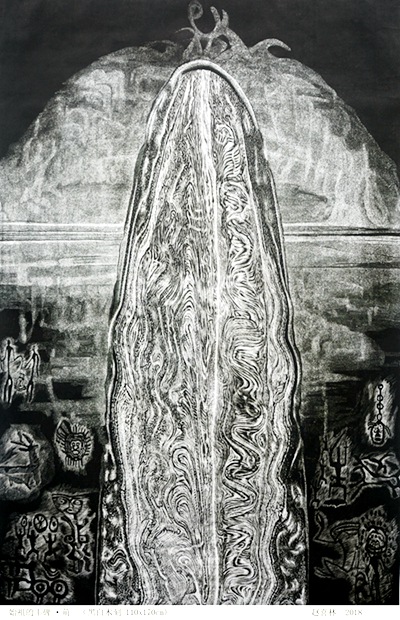赵喜林系农工党党员,大兴安岭地区版画院研究员,黑龙江省画院、版画院研究员、黑龙江省美协会员、大兴安岭美术家协会理事。多年来,赵喜林创作的近几十幅版画作品,在国内各级、各类画展中入选,2018年创作的《时空•圆舞曲》曾入选澳门文化局主办的第三届澳门版画三年展。此次虚苑国际版画双年展入选的作品为《始祖的丰碑•萌》,该作品创作于2018年,是《始祖的丰碑》系列作品萌、行、腾、息四个篇章之一。该系列作品体现的是:“宇宙混沌,地壳变迁,人类慢慢行走于这方天地间。地球因有了人类,而日渐繁荣,远古文化承载历史,传承文明。”《萌》这一篇章则昭示着万物的开始,一切皆在萌发,变化,岩画等远古的符号,它是远古的文明,是人类崇拜的图腾。该作品在今年也入选2018年第三届中国版画大展。(张占军)