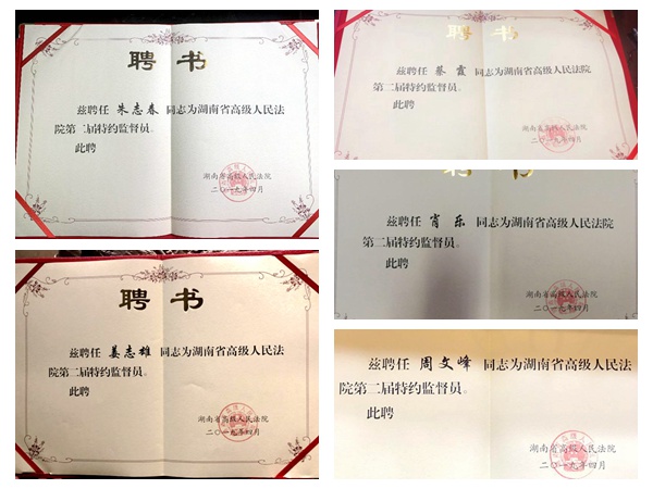 这次聘请的40名特约监督员,有人大代表、政协委员,有民主党派、工商联和无党派人士,还有专家学者,来自不同部门、不同行业、不同地区。(邱现平)2019年5月16日,湖南省高级人民法院举行第二届特约监督员聘任仪式,农工党湖南省委会有五位党员被聘为湖南省高级人民法院第二届特约监督员。湖南省高级人民法院党组书记、院长田立文,省委统战部副部长、省工商联党组书记陈潇为特约监督员颁发聘书。