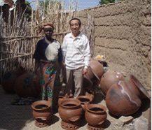 与黑人朋友们处久了,他们也很热情,常邀请队员们到他们家里做客。我发现他们总是用三块石头撑起锅烧柴煮饭,起初以为是临时性的,后来发现家家如此,连州长家也不例外,尽管他家冰箱,彩电,汽车都齐全,甚至还有液化气灶,但无汽源时仍是如此。厨屋里的墙壁顶棚乌黑,积满灰尘。原来这是他们的用火习惯,根本不懂如何垒灶排烟。我帮一个护士家垒了第一个灶时参观的人如同过节。第一次看到烟气排到屋外,而且火势抽劲大,做饭快,护士一家把它当成了一种荣耀,见人就展示。过了一段时间我发现人们并没有照着给自己家垒灶,原来垒灶用的灶篦铁条和灶门铁皮一般人家里没有,水泥价格比国内白面还贵,所以没能得到推广。经过观察我发现当地人家里常用来装水装粮的土陶罐制作非常简单,于是稍作改变,制成了火炉状,烧出来后褐红光滑非常可爱,并且搬动容易价格便宜,很快得到了大量复制,等我回国前陶火炉卖点已经成了当地自由市场的一道风景。