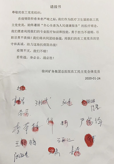 “尊敬的农工党组织,在疫情防控愈来愈严峻之际,我们作为医疗卫生届的农工党党员……我们愿意利用我们的专业医疗知识和技能,勇于担当不退缩,尽职尽责不畏惧!疫情不灭,我们不缩!若有战,身必去,站必胜!”,1月24日之际,农工党徐州矿务集团支部委员会主委、徐州矿务集团总医院呼吸科大内科主任赵杰带领党员写下请战书,颗颗红手印代表着党员们坚定的决心,他们同时向医院申请,前往武汉一线支援,由于医院工作需要安排,他们中有多名党员三次请战武汉被拒,于是他们坚守好岗位,争取做得多一点、再多一点……他们有的留在医院发热门诊,有的为援鄂的同事准备行囊、做好家人安抚工作,有的捐款捐物,有的前去献血……