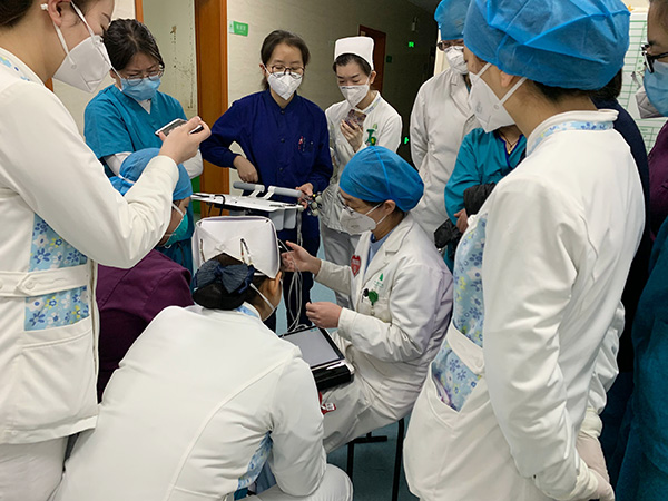 功能科主任姚娟的爱人是妇儿结核科的副主任医师,进入隔离病区工作,姚娟本人则也在战"疫"工作冲在一线,进入隔离病房为确诊和疑以的患者做心电检查。她带领功能科医生通过网络心电信息系统发送图形数据,心电图室做出检查结论,结果再通过系统回传到电子病历中,病房的医生就可以在电子病历系统中查看到这份电子报告。一方面可以快速检查快速诊断,另一方面节省了防护用品,减少了交叉感染。明明同在一家医院工作,双方却只能通过微信视频给予关怀。往往短暂的电话和安慰,两名医生又重新投入了自己的工作。