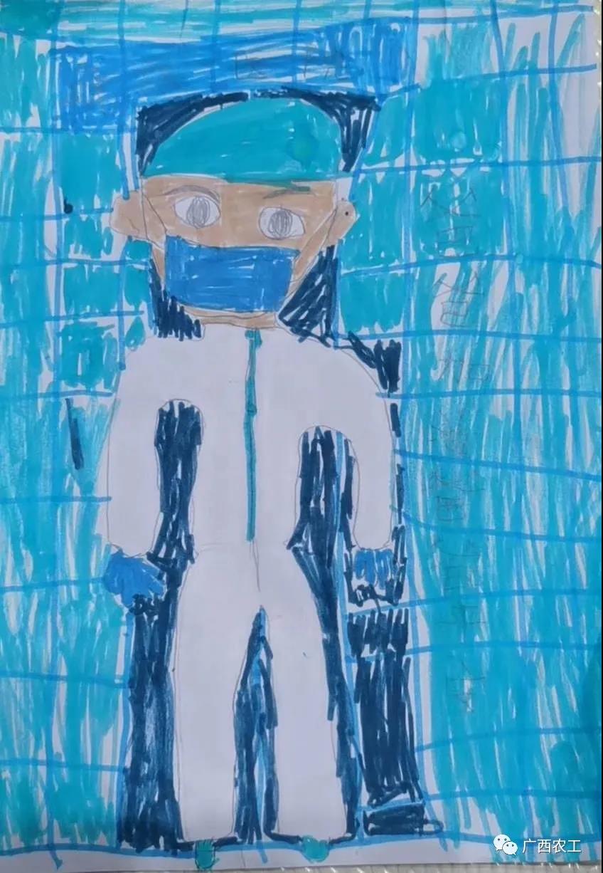 一幅充满童趣的画出现在了刘品晶医生的朋友圈里,附言是:“女儿眼中的我”。画面里刘品晶医生身穿防护服,头带防护帽,带着口罩和医用手套,只露出了两只大大的眼睛,目光温暖而坚定地注视着前方,旁边写着八个字:爸爸加油!爸爸平安!