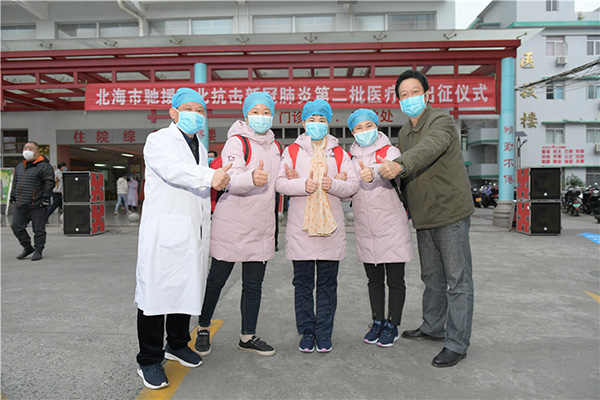 温燕霞(左四)、黄江(左一)在北海市举办的出征仪式后与同事们合影