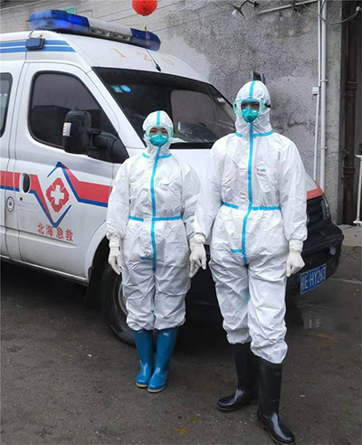温燕霞(左一)将一例新冠肺炎疑似病例转运到北海市定点医院