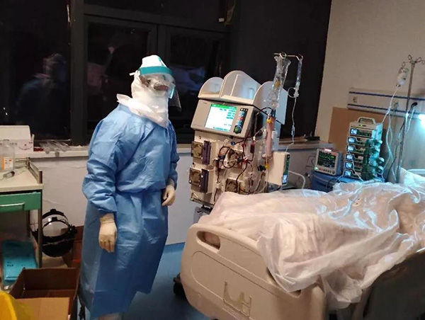 2月18日是曾冬生的第一个夜班,也是来黄冈的第一个班,从晚8点到次日凌晨2点。对于他来说,最大的障碍不是临床操作,而是身体和心理的煎熬。进监护室的各种装备穿戴整齐需要30分钟,出监护室就需要近1小时,由于防护严密,导致他呼吸不畅,出汗乏力,甚至头晕呕吐。一位护士赶忙将他扶到药箱上坐下。他放松呼吸,适应状况后又投入到紧张工作。交接班后,他了解到病人的病情都十分严重,12个病人中使用呼吸机的有6个,其他的使用高流量氧疗仪,随时有病情恶化危及生命的危险。跟时间赛跑间隙,他表示,坚决克服各种困难,救治危重患者,在全体医疗队员的共同努力下,为早日战胜疫情,贡献自己的最大力量。