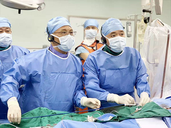 罗建方首先使用20mm直径的球囊,把钙化的主动脉瓣扩开,然后经股动脉送入29mm直径大小的生物瓣膜支架,在临时起搏器的快速起搏下精准释放瓣膜,瓣膜位置良好,瓣周轻度返流,术后测量跨瓣压差为0。