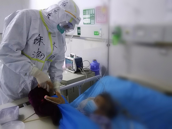 从公安县转过来的李阿姨,经过治疗后病情明显好转了,但情绪还是很低落。我跟阿姨说,我是广东医疗队队员,问她有什么担心的,需要什么帮助?原来李阿姨自己因为病重转来了,但儿子还在当地医院住院,家里还有个12岁的孙子,担心没人照顾。我鼓励阿姨说:“阿姨别担心,我帮您问一下,您自己也一定要有信心,您现在的病情已经有所好转了!”