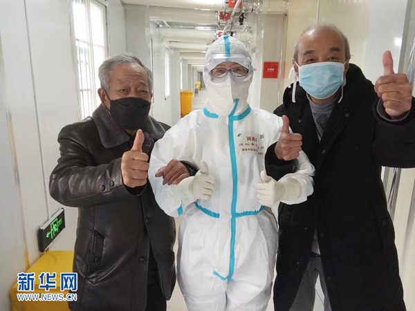 77岁的重症患者陶先生(右一)3月12日出院时,在雷神山医院与刘禹翔合影