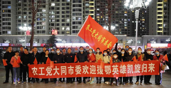 援鄂农工党党员医护人员归来的消息一大早就在大同农工微信群里迅速传开,党员们听到这个振奋人心的消息时,顿时沸腾了,群里发起了长长的“欢迎英雄回家”的字幕和参加欢迎仪式的名字接龙。虽然知道车队归来还早,但下午五点半党员们早早地等候在迎宾街,每人手里举着鲜艳的国旗,讨论着英雄的事迹,脸上洋溢着喜悦和期盼。