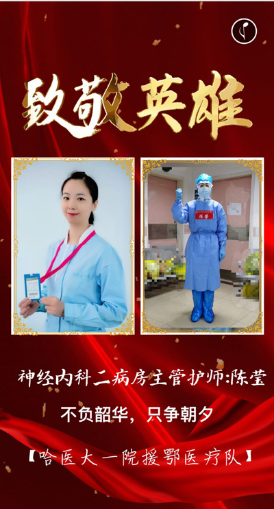 陈莹,女,哈尔滨医科大学附属第一医院神经内科二病房主管护师,支援武汉,2月13日—3月21日武汉市第一医院第14和15重症病房护士,3月22日—3月31日转战武汉大学人民医院东院重症病区,离家48天。
