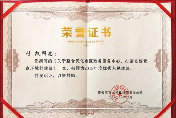 据悉,全市共有5件建议获得该奖项。此建议是付凯2019年撰写的,其中指出,建议连云港市整合优化政务服务资源,切实提高服务质量和效率,加强监督问责和考核工作,提高为企业和市民服务的水平。去年6月,中共连云港市市委常委、常务副市长王加培同志对此建议作出批示:“首先对付凯同志为优化营商环境荐言献策表示感谢。请市政务办对建议进行认真研究,切实改进服务质量、方便群众。也可以聘付凯同志担任政风监督员。”