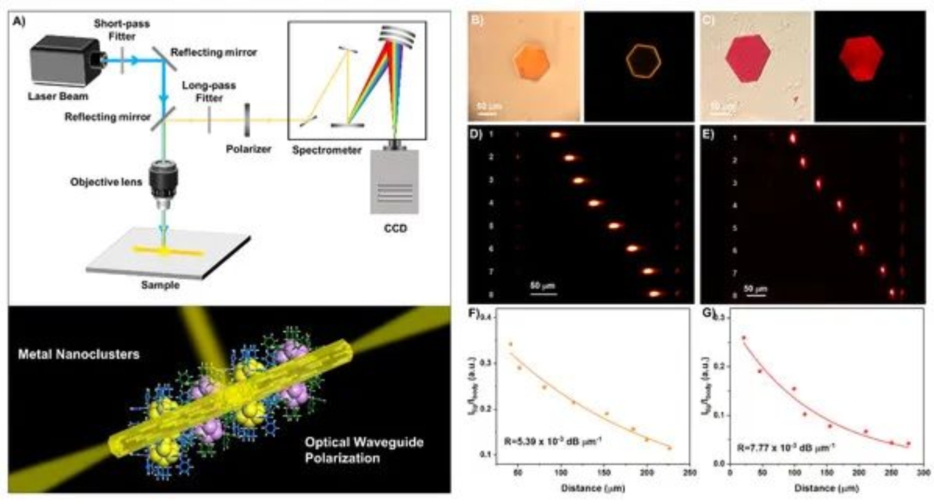 作者合成了具有橙色荧光的[Pt1Ag18(S-Adm)2(DPPP)6Cl6](SbF6)2和具有红色荧光的[AuxAg19-x(S-Adm)2(DPPP)6Cl6](ClO4)3纳米团簇,它们具有较低的光损耗系数和极高的偏振比。