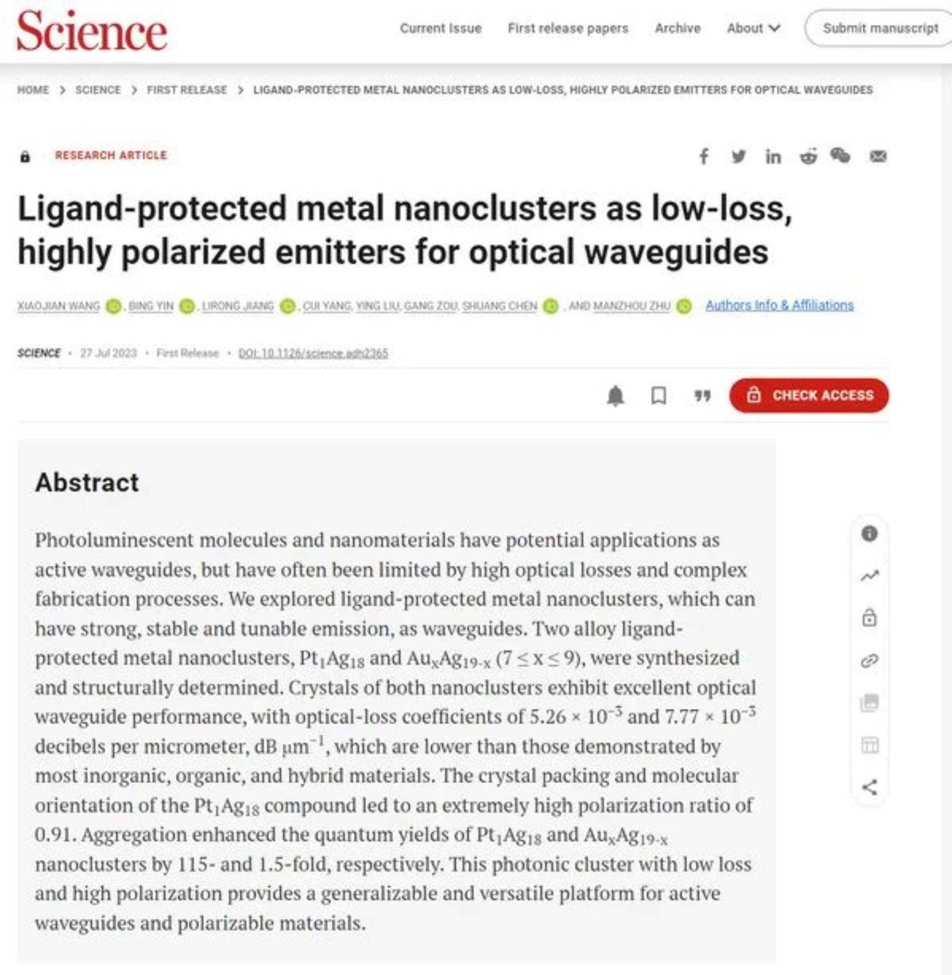光波导是实现光电集成和光子集成的关键。在发展小型化光电器件中,可以在微观尺度传导和弯曲光的微米量级甚至纳米量级的光波导材料极为重要。光致发光分子和纳米材料作为有源波导具有潜在的应用前景,但往往受到高光学损耗的限制。在最新的science中,安徽大学朱满洲教授、陈爽副教授团队报道了配体保护的金属纳米团簇(LPMNC)可以作为光波导材料,具有强、稳定和可调谐的光发射性能。研究人员合成并确定了两种合金配体保护的金属纳米团簇 Pt1Ag18 和AuxAg19-x (7≤x≤9)。两种纳米团簇的晶体均表现出优异的光波导性能,光损耗系数分别为 5.26 × 10−3 和7.77 × 10−3 分贝每微米(dB μm−1),低于大多数无机、有机和杂化材料所表现出的光损耗系数。Pt1Ag18 化合物的晶体堆积和分子取向导致了0.91 的极高偏振比。聚集使 Pt1Ag18 和AuxAg19-x纳米团簇的量子产率分别提高了115 倍和 1.5 倍。相关研究成果以题为“Ligand-protected metal nanoclusters as low-loss, highly polarized emitters for optical waveguides”发表在最新的《Science》上。在金属纳米团簇材料中发现了重要的光传播新现象,有非常重要的潜在应用价值,是材料科学前沿的重要研究成果。