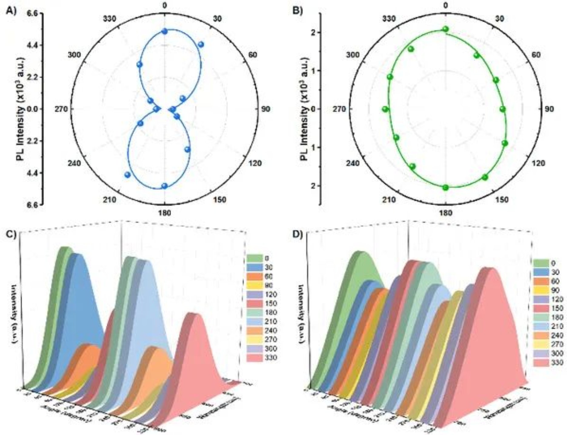 作者进一步测试了棒状晶体的发光强度与偏振角度之间的关系,并使用sin2曲线进行拟合。Pt1Ag18在8°和188°的偏振角处显示出最高的荧光强度,在98°和278°处显示出最低的荧光强度,导致发射二向色比(Rd=I8°/I98°)为21.4,偏振比(ρ=(Rd-1)/(Rd+1))为0.91,Pt1Ag18表现出极高的偏振特性。AuxAg19-x在174°和71°处的荧光强度也分别最高和最低,偏振比ρ为0.17,AuxAg19-x表现出弱的偏振特性。两者的差异归因于纳米团簇实体的部分各向异性结构及其不完全对称的堆积模式。