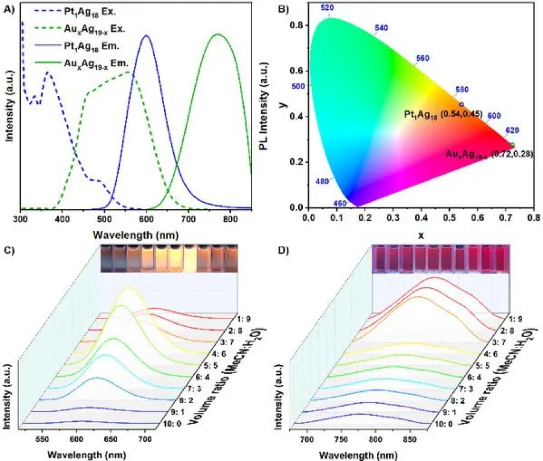 Pt1Ag18溶液最大发射集中在600 nm处(图5A),此时的量子产率为0.25%,而Pt1Ag18固体表现出强烈的橙色发光,量子产率为28.92%(图5B)。AuxAg19-x溶液在770 nm处显示出较弱的红色发光(图5A和B),量子产率为4.66%(图5A和5B),但固态下的量子产率为6.91%。此外,Pt1Ag18和AuxAg19-x都具有聚集诱导发射增强性质,在乙腈和水的混合溶液中,Pt1Ag18的最大发光强度是纯乙腈溶液的30倍,AuxAg19-x的最大发光强度是纯乙腈溶液的5倍。