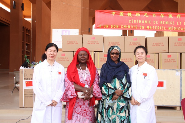 邬佩云(左一)参加中国援尼医疗器械交接仪式
