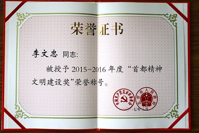 农工党党员李文忠荣获2015-2016年度“首都精神文明建设奖”