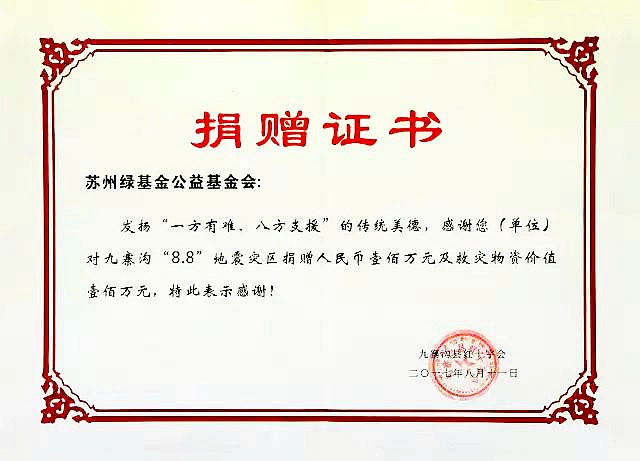 苏州农工党党员企业家徐建成先生公司苏州绿叶向九寨沟地震灾区捐赠100万元现金和100万元生活物资