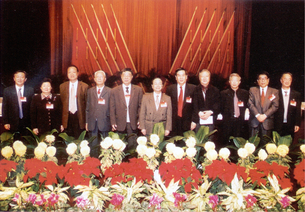 2002年12月,农工党第十三届中央领导班子合影.从左至右:王宁生、左焕琛、陈宗兴、朱兆良、阎洪臣、蒋正华(主席)、李蒙(常务副主席)、宋金升、陈建生、张大宁、桑国卫