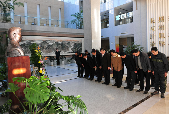 图为:陈竺主席、龚建明副主席和农工党中央机关党员向邓演达烈士鞠躬致敬