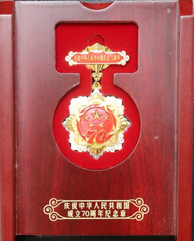 “庆祝中华人民共和国成立70周年”纪念章是国家级荣誉,由中共中央、国务院、中央军委颁发,以此对新中国成立前参加革命工作的老战士、老同志等为中国革命和建设发展做出贡献的健在人员进行特别嘉奖。纪念章使用铜胎镀金材质,核心部分为五星,代表国家荣誉。“70”飘带象征中华人民共和国70年奋斗历程。章体外环以如意祥云、光芒构成,象征人民对美好生活的向往,同时表达隆重庆祝中华人民共和国生日,礼赞国家富强、民族振兴、人民幸福的辉煌成就,以及在70年辉煌奋斗成就的基础上不忘初心、继续前进的坚定决心。这是新中国成立70周年系列庆祝活动的重要组成部分。(吴燕明)
