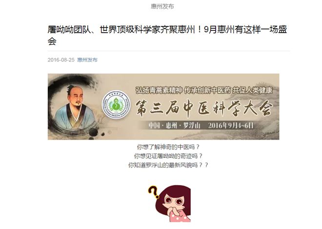 伴随着周杰伦《青花瓷》的优美旋律,一幅幅以青花瓷为背景的画面徐徐展开,罗浮山、葛洪、青蒿素、屠呦呦、国医大师、医学院士、4位诺贝尔奖获得者……伴随着中华传统韵味展现出的微信H5页面,正式宣布:《第三届中医科学大会即将开幕》。