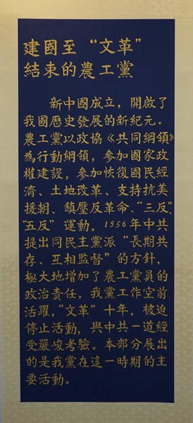 新中国成立,开启了我国历史发展的新纪元。农工党以政协《共同纲领》为行动纲领,参加国家政权建设,参加恢复国民经济、土地改革、支援抗美援朝、镇压反革命、“三反”、“五反”等运动。1956年中共提出同民主党派“长期共存、互相监督”的方针,极大地增加了农工党员的政治责任,我党工作空前活跃。“文革”十年,被迫停止活动,与中共一道经受严峻考验。本部分展出的是我党在这一时期的主要活动。