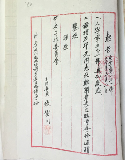农工党北京市党务整理委员会主委张云川:关于报送王守先同志死难调查表及略传的函(1951年)