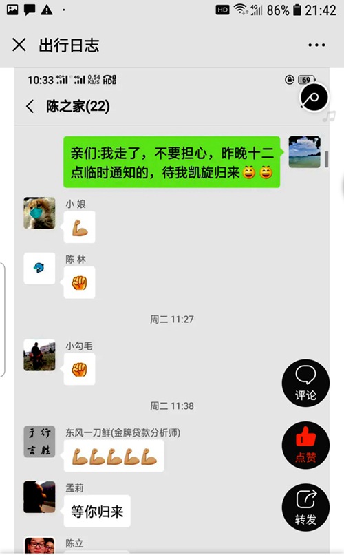 在她的家人微信群里,高薇乐观而坚定地留言:“亲们:我走了,不要担心,昨晚十二点临时通知的,待我凯旋归来。”表达她对抗击疫情的信心和决心。