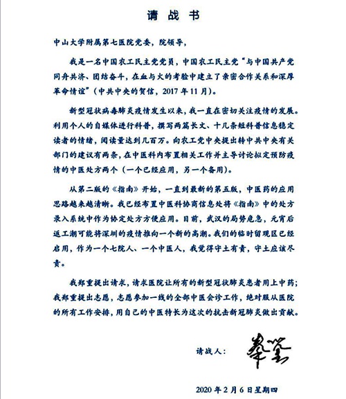 大年初一,中大七院开始建临时留观区,准备接收深圳市光明区的新型冠状病毒肺炎病人。此时,作为医院新冠肺炎专家小组的成员,秦教授写了第一份请战书。由于该院建筑投入推迟了,直到投入使用前的2020年2月6日,秦教授又写了第二份请战书,再次向医院党委、院领导郑重提出请求:参加一线的全部中医会诊工作,绝对服从医院的所有工作安排,用自己的中医特长为这次抗击新型冠状肺炎做出贡献。在这个过程中,深圳市要求中山七院(中山七院是深圳市所有,整体划归中山大学管理)派一名副高以上的中医师支援深圳市三院的抗疫工作。秦教授在中医科开了会,提出自己去支援,结果没被选上。毕竟是54岁的人了,在看不见、摸不着的烈性传染病面前,极具挑战性。尤其在前线,离病人越近,被感染的风险就越大,也许这些都是单位选派人员的考虑。但秦教授请战心愿迫切,第三批选派的时候才终于有他。