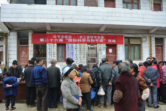 今年是 “国际科学与和平周”活动第26周年,围绕今年的“和平·发展·环保·健康”主题,2014年11月13日,毕节市政协、农工党毕节市委组织有关专家赴织金县大平乡开展与主题相关的科普宣传、义诊、心理健康咨询、法律咨询等活动。