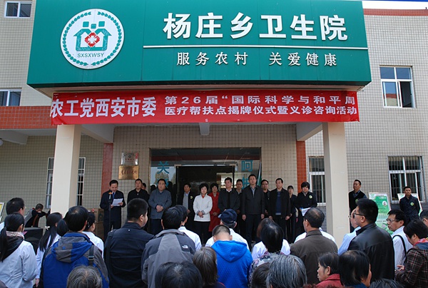 2014年11月12日下午,农工党西安市委会在全市统战系统服务科学发展实践基地杨庄街道开展第26届“国际科学与和平周”医疗帮扶点揭牌仪式、志愿者服务队授旗仪式暨义诊咨询活动。中共西安市委常委、市委统战部部长史晓红和陕西省高院副院长、市政协副主席、农工党西安市委会主委黄河共同为农工党西安市委会在卫生院的“医疗帮扶点”揭牌,此次活动将成为农工党西安市委会帮扶工作常态化、规范化、品牌化的新起点。