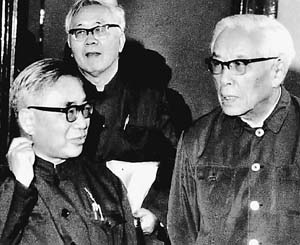 卢嘉锡同志与周培源教授(右)、华罗庚教授(后)交谈。