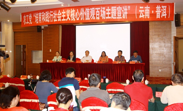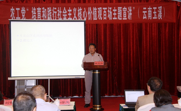 2016年4月26日、27日,农工党“走进基层,贴近党员,农工党培育和践行社会主义核心价值观百场宣讲”走进云南玉溪、普洱,安徽六安市政协副主席、农工党六安市委会主委孙学龙,全国劳动模范、农工党西双版纳州支部主委、西双版纳石化集团董事长柳天伟,农工党云南省委会专职副主委何云葵,农工党党员、山东菏泽市规划局分局副局长张莉莉,分别在两地作宣讲。