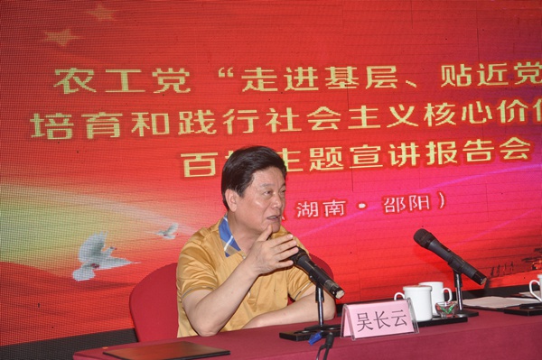 2016年8月5日上午,农工党“走进基层、贴近党员,培育和践行社会主义核心价值观百场宣讲”报告会在邵阳开讲。农工党邵阳市委会主委毛学雄主持宣讲会。中共邵阳市委统战部常务副部长吴承红、干部党派科科长金永辉应邀出席。
