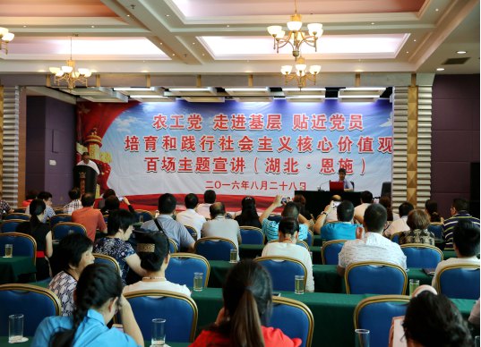 2016年8月28日下午,农工党“走进基层,贴近党员,培育和践行社会主义核心价值观”百场主题宣讲走进湖北省恩施土家族苗族自治州。宣讲团成员由湖北省政协常委、副秘书长、农工党湖北省委会专职副主委、经济学博士、研究员严炳洲同志,农工党湖北省委会办公室主任、上海复旦大学政治学博士刘晖同志组成。农工党湖北省委会秘书长、组织部部长方奇,恩施州人大常委会副主任、原农工党恩施州委会主委刘青,农工党湖北省委会宣传部部长张妮、组织部调研员周福珍,农工党恩施州委会主委杨德华,农工党恩施州委会副主委向仕莲、向建强、颜益志、张登仕等出席宣讲活动。宣讲报告会由农工党恩施州委会主委杨德华主持。