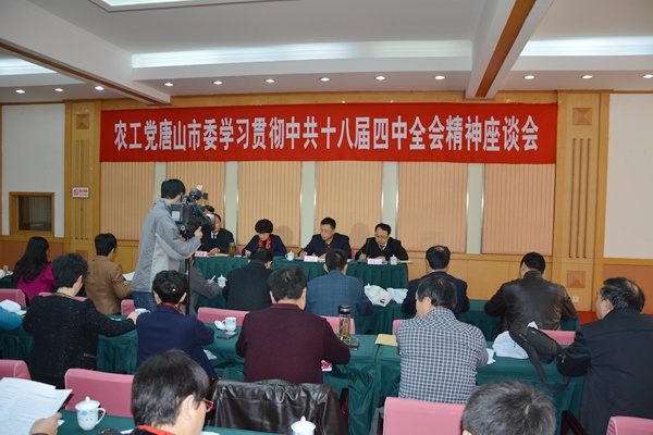 2014年11月12日,农工党唐山市委会在唐山宾馆1号楼1号会议厅召开学习贯彻中共十八届四中全会精神座谈会。唐山市政府副市长、农工党唐山市委会主委高瑞华主持会议并讲话,市委会副主委王宗英、王大力参加了会议。中共唐山市委统战部常务副部长宗玉田、党派处副处长史铁应邀出席会议。