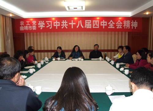 2014年11月5日,农工党曲靖市委会召开座谈会,专题学习贯彻中共十八届四中全会精神。农工党云南省委会副主委、农工党曲靖市委会主委王明琼主持会议并讲话。