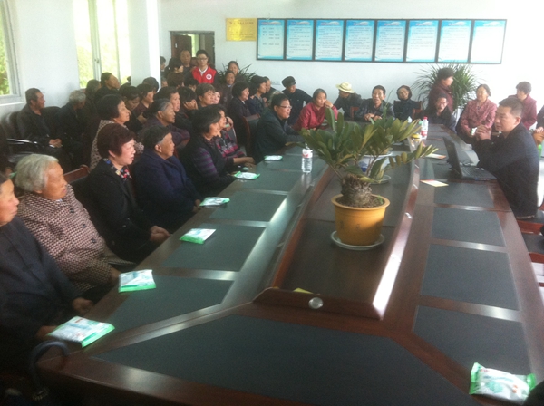 上午10点,志愿者们随苍南县疾控中心及桥墩卫生院的同志一同来到了凤岭村。凤岭村地处山区,环境恶劣,常驻人口以留守老人为主。针对这一特点,志愿者们委托镇卫生院的同志为当地的百余名老人送上一场有关老年常见病的预防知识的讲座。讲座中,老人们不时点头,对有益健康的方法表示赞同,时而思考反省自己在日常生活中的不利健康的习惯。整场讲座深入浅出,形象生动。志愿者还为老人们进行了血压的测量,耐心地为他们讲解高血压应注意的事项。活动最后,还为到场的每位群众送上了控油壶、计步器、肥皂和牙刷等健康宣教品及生活必需品。