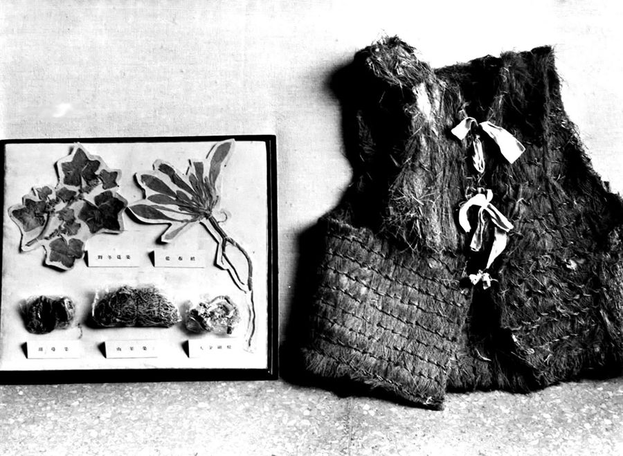 红军长征时吃过的野菜的标本(左)和穿过的棕背心 新华社图片