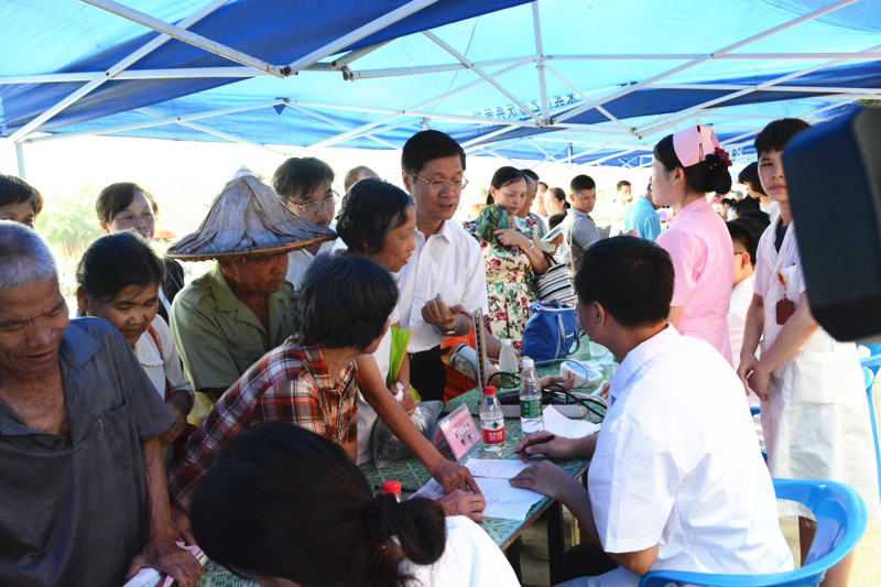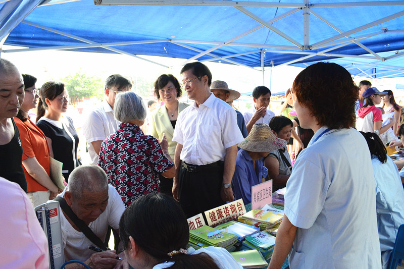 图为彭钊主委在义诊、环境与健康咨询现场看望前来咨询的群众