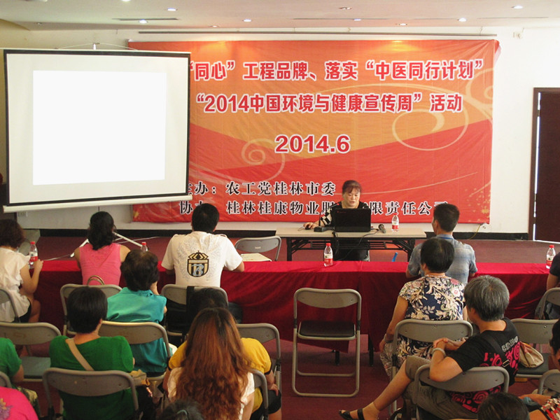 临桂金水湾•境界社区是桂林市委会与中共临桂区委统战部共建的“同心•和谐书香”小区。活动当天,农工党桂林市中医医院总支副主委、中医医院营养科主任荣军为社区100多名群众做题为“城市环境与健康”的多媒体讲座,桂林市中医医院的4名内、外科和儿科中医专家为社区群众义诊,开展健康咨询,就大家关心的环境和健康问题答疑解惑,发放宣传资料和卫生用品300余份,广泛宣传了加强环境保护和倡导健康生活的理念,受到社区群众的热烈欢迎。(陆广济)