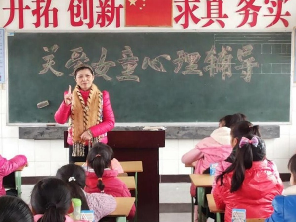 图为农工党四川眉山市总支党员志愿者为眉山市东坡区富牛镇新华小学40多名农村留守女学生讲授《女童安全知识课》
