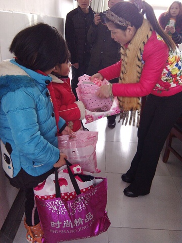 车行至学校,爱心志愿者们来到两个贫困孩子的身边,农工党的叔叔阿姨们为杨震、吴铃颖分别送上了时尚、宽松、温馨的羽绒服,还送了防寒内衣、袜子、手套、袖套、肥皂、香皂、护手霜等日常生活用品,以及书籍、本子、铅笔等学习用品。春节临近,为让孩子俩过好节日,叔叔阿姨们还为她们俩带来了腊肉、香肠等一些过年食品。杨震、吴铃颖两名贫困学生手捧这些价值1100多元的慰问物品,看着关心帮助她俩的农工党叔叔阿姨们,感动地一时难以言表,连声说“谢谢!谢谢!”。